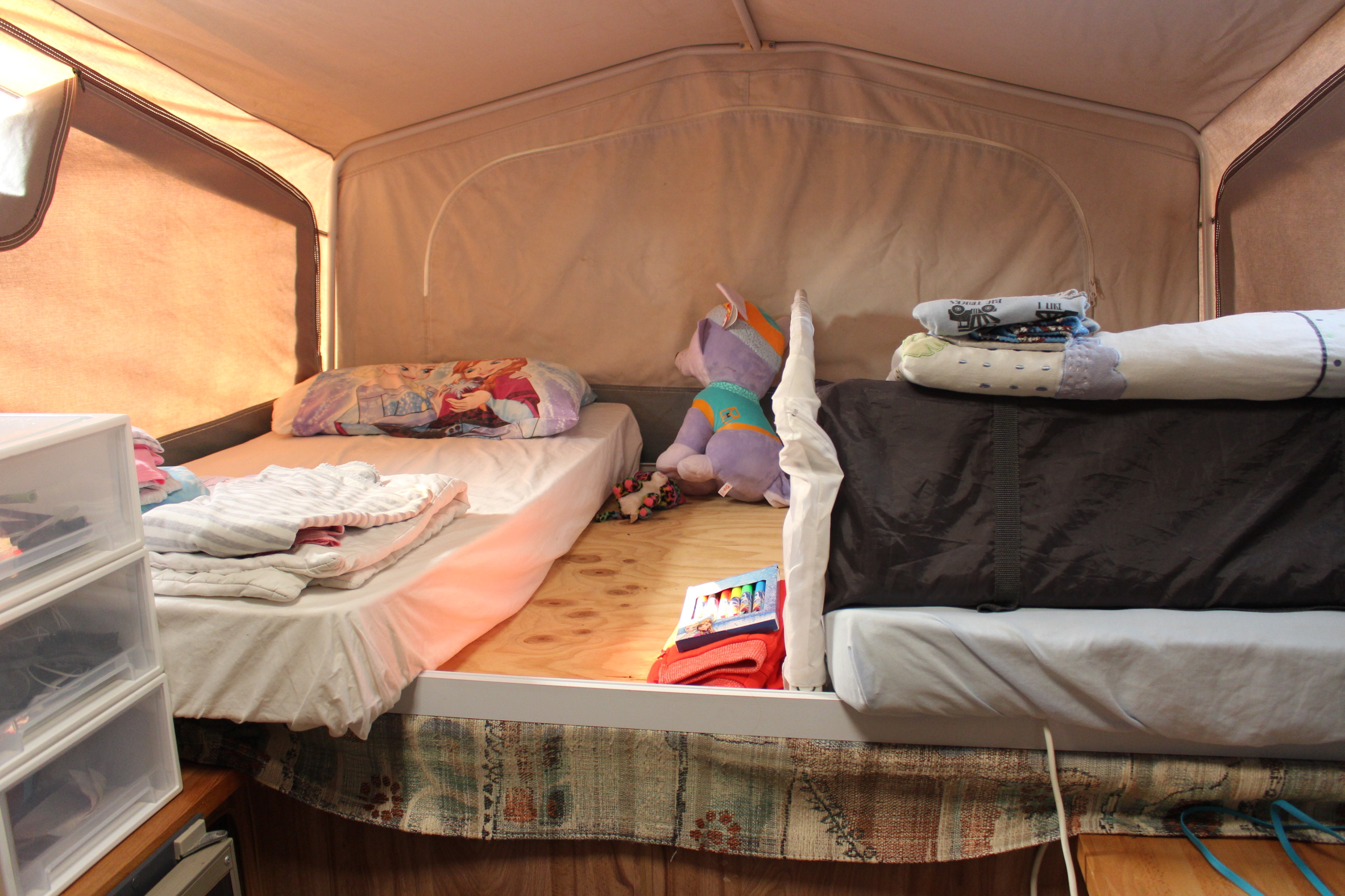 Once you unhitch it from the car, there’s still a bit of faffing involved to set it up. You have to wind the legs down so that its level, crack up the top to push and pop out the beds and then set up the annexe. The annexe isn’t a necessity but it gives us about another 2 x 3 meters of space which we use for our camp kitchen and our clearly labelled storage tubs of clothes and living items. The first time we set it up it took about 5 hours from beginning to end but now we’ve got into a bit of a routine and each know our little roles in the process we’ve got it down to a little over 2 hours. We still haven’t managed to do it without a fight yet – hopefully we’ll get better at that too.